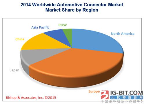 下圖為世界各地區(qū)的汽車連接器市場情況。市場份額由每個區域連接器的銷售額決定。
