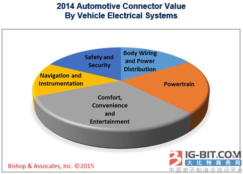 BishopAssociates將汽車連接器分解成五個車輛電氣係統:車(chē)身配線和配電係統;動(dòng)力總成係統;舒適性、方便性和娛樂性係統;導航和儀表(biǎo);安全及安防係統。