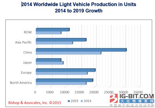 下圖為(wéi)全球各地區生產輕型車(chē)輛的產量(liàng)增長情況預測。