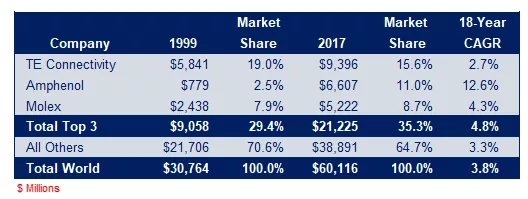 1999年,TE,Amphenol,Molex三大公司總共擁有29.4%的連(lián)接器市場份額。到2017年,三大公司(sī)占有(yǒu)的市場份額上(shàng)升到35.3%。
