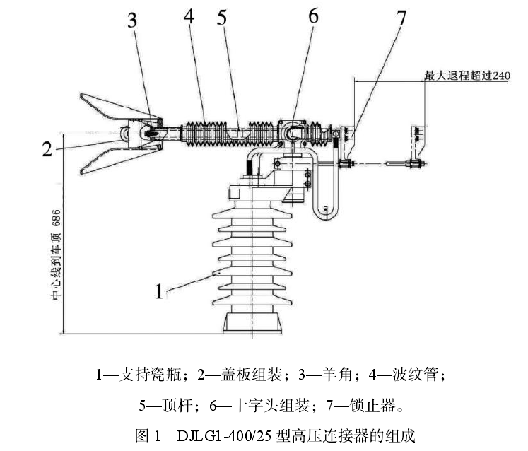 高壓連接(jiē)器廣泛用於交流和直流八軸電力機車,主要由支持瓷瓶、蓋板組裝、羊角、波紋管、頂杆、十字頭組裝、鎖止器等組成,如圖1所示。其主要功能(néng)是實現八軸電力機車A節和B節車頂高壓電路的可靠(kào)連接,並可在司機(jī)室中實現控製,避免(miǎn)危險的車(chē)頂(dǐng)作業發生。在批(pī)量生(shēng)產(chǎn)中,偶(ǒu)爾(ěr)會出現兩個對接(jiē)的高壓連接器分離後無法再次對接的情況。