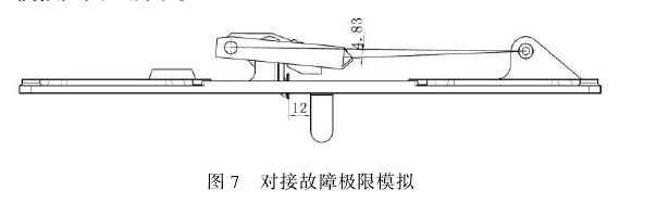 圖7表明當鎖舌與蓋板的寬度等於環的直徑(12 mm )時,卡箍與(yǔ)彈簧連接(jiē)軸的位置比正常的位置向上移(yí)動4.83 mm。此時(shí),卡箍與彈簧連接軸、卡箍與鎖舌連接(jiē)軸、蓋板與鎖舌連(lián)接軸三者處於同一直線,達到平衡。這(zhè)是對接故障發生的臨界點,所以,當卡(kǎ)箍(gū)變形(xíng)使卡箍與彈(dàn)簧連接軸向上移動大於4.83 mm,就會發生(shēng)對接故障(zhàng)。對接故障極限模擬如圖7所示。