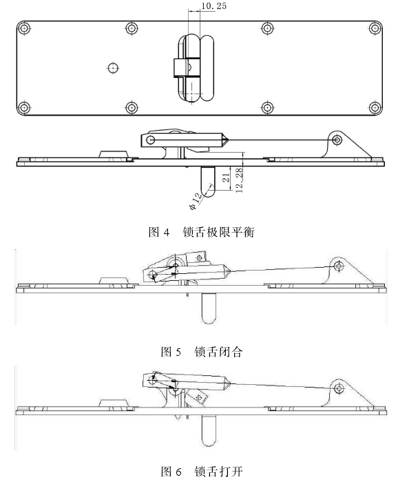 圖3中的四連軸結構隻(zhī)要旋轉(zhuǎn)任意一軸(通過角度(dù)約束實現),其他幾軸便同(tóng)時旋轉,用這種聯動的方式對(duì)鎖舌各種狀態進行定量分析。當四軸處在一條直線上,係統(tǒng)受力平衡,鎖舌靜止,如圖4所示;鎖舌關閉(bì)狀態對應高壓連接(jiē)器對接狀態,圖4表(biǎo)明(míng)環的高度(27 mm)大於鎖舌靜止狀態(tài)前端距蓋板的高度(12.28 mm ),高壓(yā)連接器對接時,環會向上頂鎖舌打破平衡,鎖舌閉合。圖5表明鎖舌閉合會(huì)受一個斜向下的力(lì)維持狀態;鎖舌打開狀態對應高壓連(lián)接器分離狀態,圖4表明環的直徑(12 mm)大於鎖舌靜止時距蓋板的寬(kuān)度(10.23 mm ),高壓連接器分離時,環會向下拉鎖舌打破平衡,鎖(suǒ)舌打開,圖6表(biǎo)明鎖舌打開受一個斜向上的力維持(chí)狀態(tài)。上述分析驗證了高壓連(lián)接器設計是正確的。