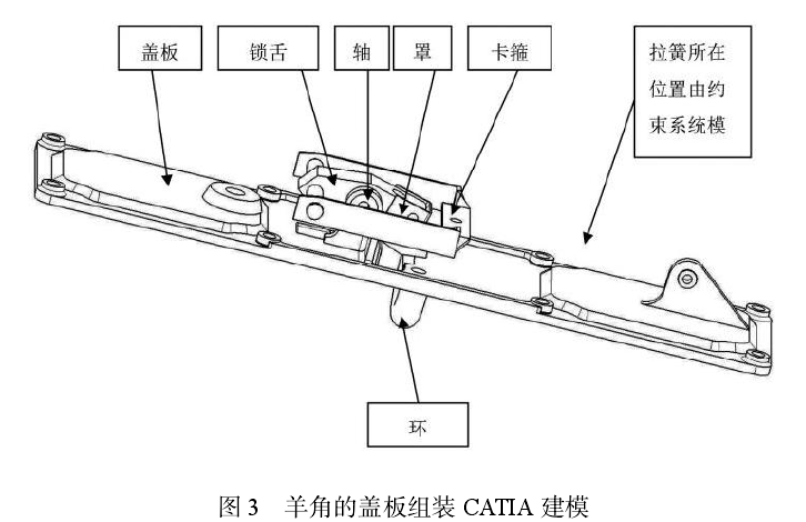 以下用CAT工A三維建模分(fèn)析卡箍(gū)變形對高壓連接器產生的影響(xiǎng)。對羊角中卡箍及相關(guān)零件進行CAT工A三維建模並組裝(zhuāng)、約束,如圖3所示(彈簧通過CAT工A的約束係(xì)統模擬)。從圖3中可(kě)以看出拉簧與蓋板由軸連接,卡箍與(yǔ)拉簧由軸連接,卡箍與鎖舌由軸連接,蓋板與鎖舌由軸連接,組成(chéng)一個複雜的四連軸結構。